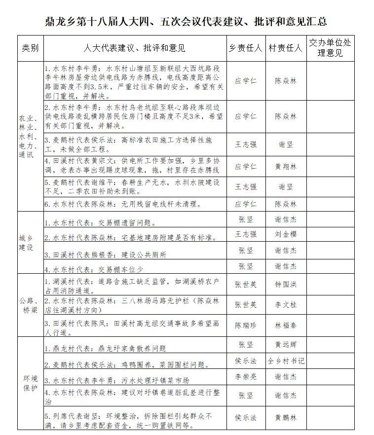 鼎龍鄉第十八屆人大四、五次會議代表建議、批評和意見匯總
