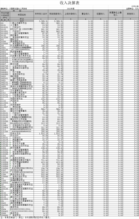 本單位2022年度收入總計3988.91萬元,其中年初結轉和結余0萬元,較2021年減少1384.93萬元,降低25.7%;本年收入合計3988.91萬元,較2021年減少789.31萬元,減低16.5%,主要原因是:鄉村振興等項目支出減少。