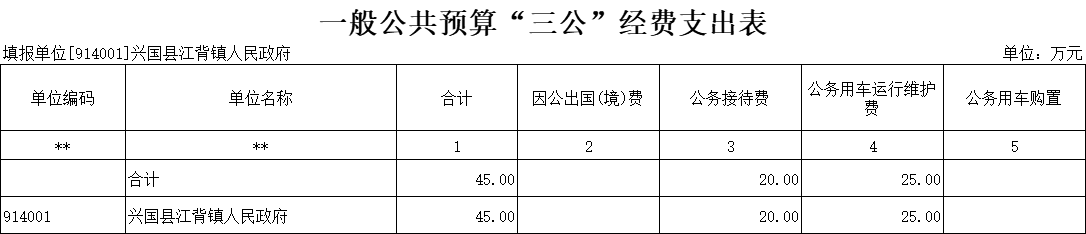 2022年興國縣江背鎮(zhèn)人民政府“三公”經費一般公共預算安排45萬元。其中: