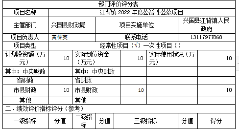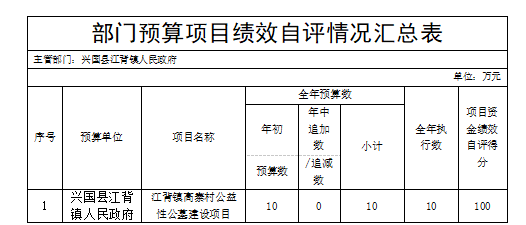 我部門今年在部門決算中反映“江背鎮(zhèn)高寨村公益性公墓建設(shè)項(xiàng)目”“江背綜合文化站免費(fèi)開放項(xiàng)目”項(xiàng)目績(jī)效自評(píng)結(jié)果。