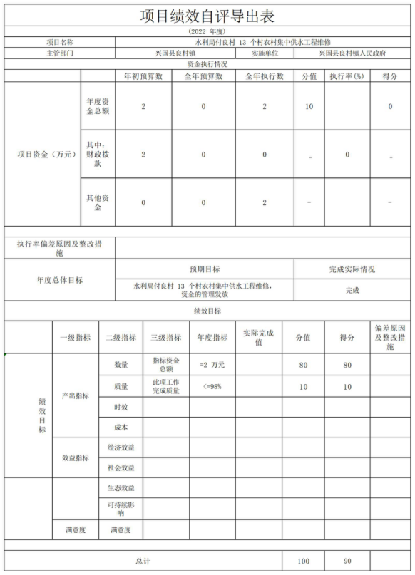 本部門公開“發(fā)改委撥良村基礎(chǔ)設(shè)施項(xiàng)目資金”、“水利局付良村13個(gè)村農(nóng)村集中供水工程維修”項(xiàng)目部門評(píng)價(jià)報(bào)告(見附件)
