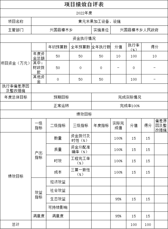 根據(jù)年初設(shè)定的項(xiàng)目自評(píng)方案,此項(xiàng)目支出績效設(shè)執(zhí)行率10分。產(chǎn)出指標(biāo)38分(分別為數(shù)量指標(biāo)10分、質(zhì)量指標(biāo)9分、時(shí)效指標(biāo)9、成本指標(biāo)10分)、效益指標(biāo)40分(社會(huì)效益指標(biāo)20分、可持續(xù)指標(biāo)20分)、滿意度指標(biāo)10分(服務(wù)對象滿意度指標(biāo)),合計(jì)98分。