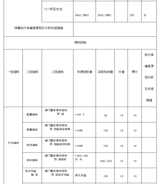 本部門項(xiàng)目績效目標(biāo)項(xiàng)目為70個(gè),全年預(yù)算數(shù)為2641.5883萬元,全年執(zhí)行數(shù)為2641.5883萬元,執(zhí)行率為100%,自評(píng)得分為100分,標(biāo)驗(yàn)收合格率為100%,驗(yàn)收及時(shí)率為100%,項(xiàng)目成本為2641.5883萬元。
