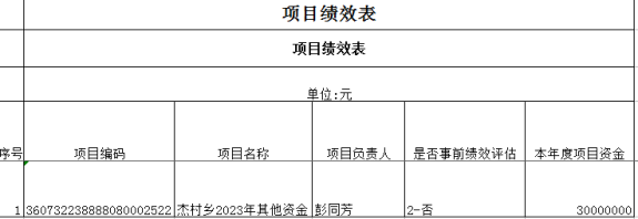 2023年實行績效目標管理的項目 1 個,涉及資金_萬元。其中:項目名稱:杰村鄉2023年其他資金