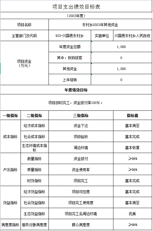 2023年實行績效目標管理的項目 1 個,涉及資金1000_萬元。其中:項目名稱:東村鄉2023年其他資金