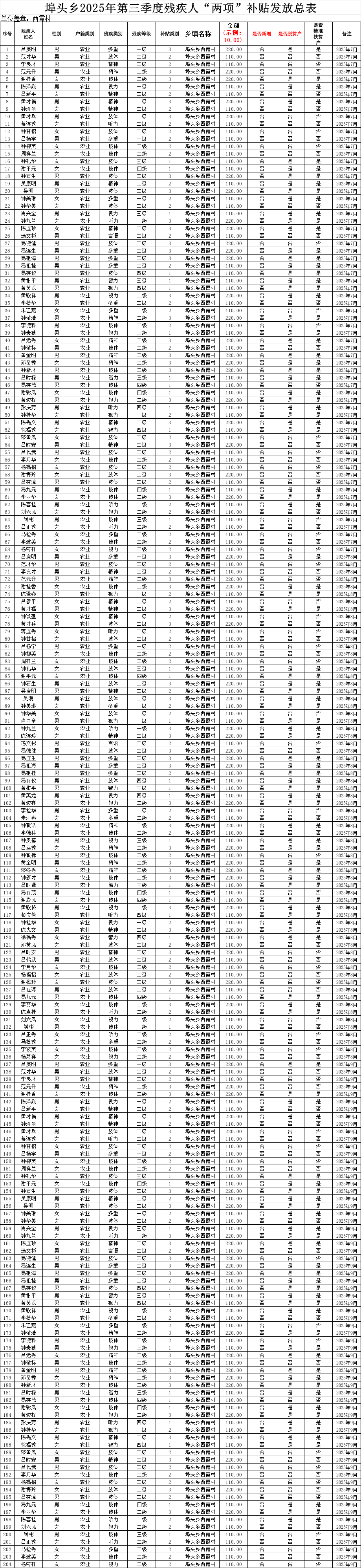 【社會救助】西霞村2025年第三季度殘疾人“兩項”補貼發放總表