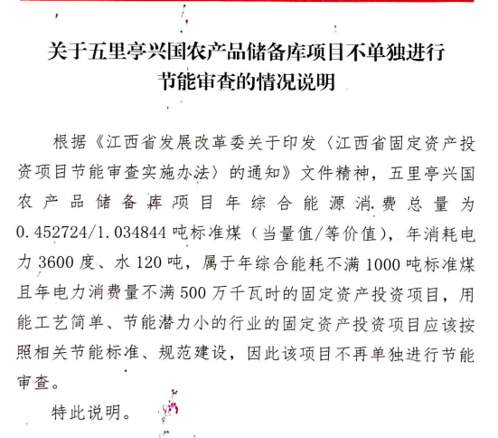 興行審投資字〔2025〕1048號關于五里亭興國農產品儲備庫項目不單獨進行節能審查的情況說明