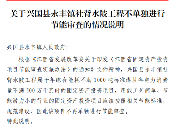 興行審投資字〔2025〕982號關(guān)于興國縣永豐鎮(zhèn)社背水陂工程不單獨進行節(jié)能審查的情況說明