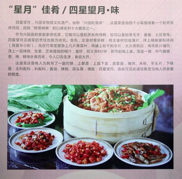 興國客家人菜譜以魚為先,講究“年年有余”的吉兆。興國人民逢年過節、操辦紅喜事和接待賓客的筵席上“四星望月”必不可缺,因為它意味著“團團圓圓、闔家幸福”。這一飲食習俗世代相傳、始終不變,而且輻射到周邊縣市,影響贛粵閩客家地區。